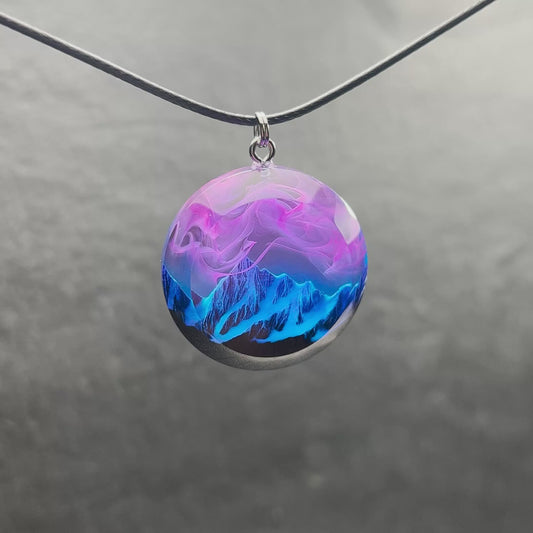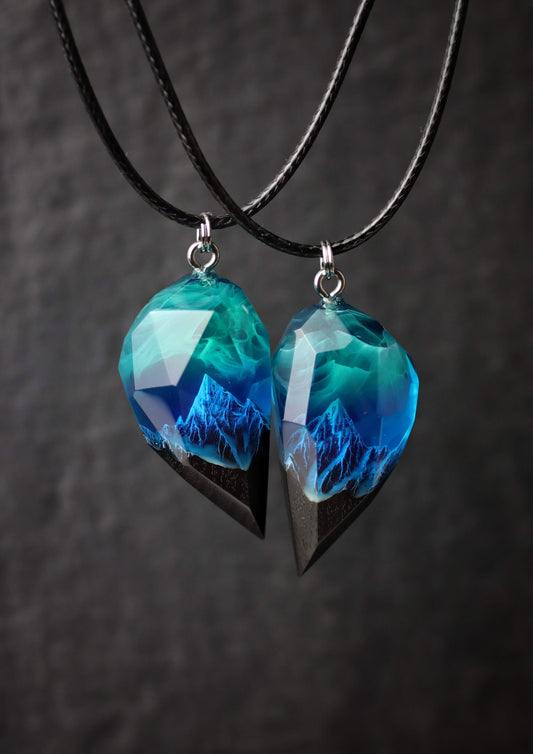 Handmade epoxy resin and wood Couple heart Northern lights Mountain pendant Faceted