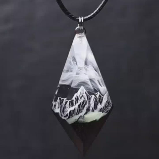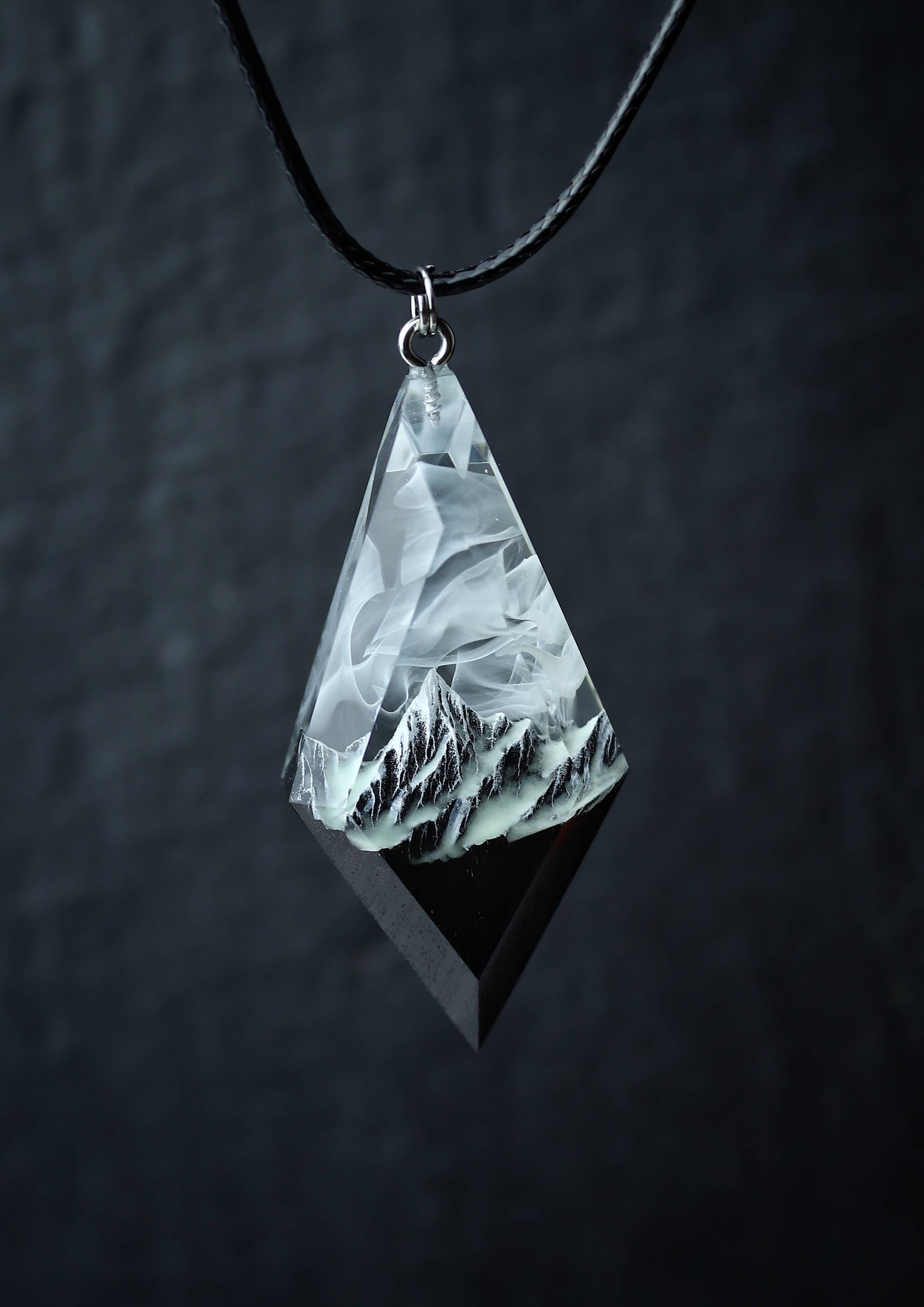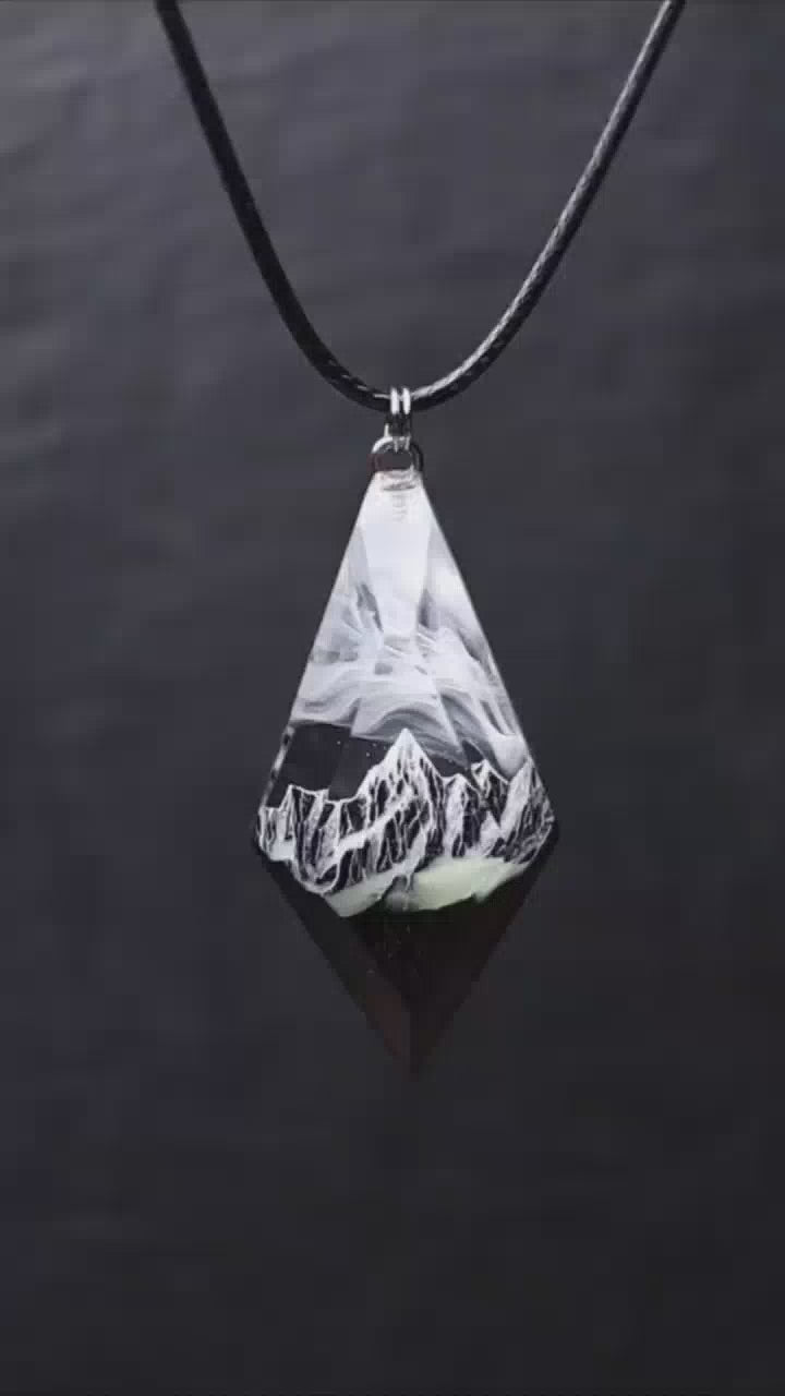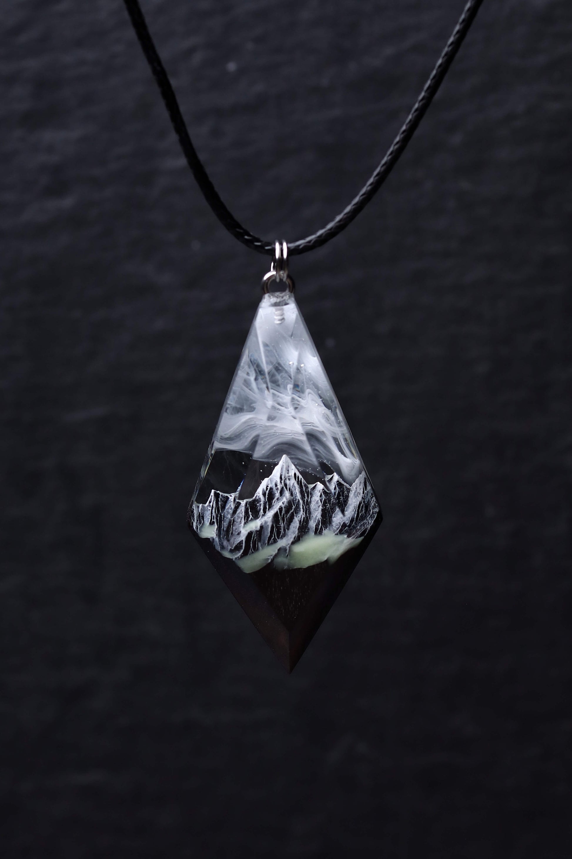 Handmade pendant from black hornbeam wood and epoxy resin with snow mountains inside.