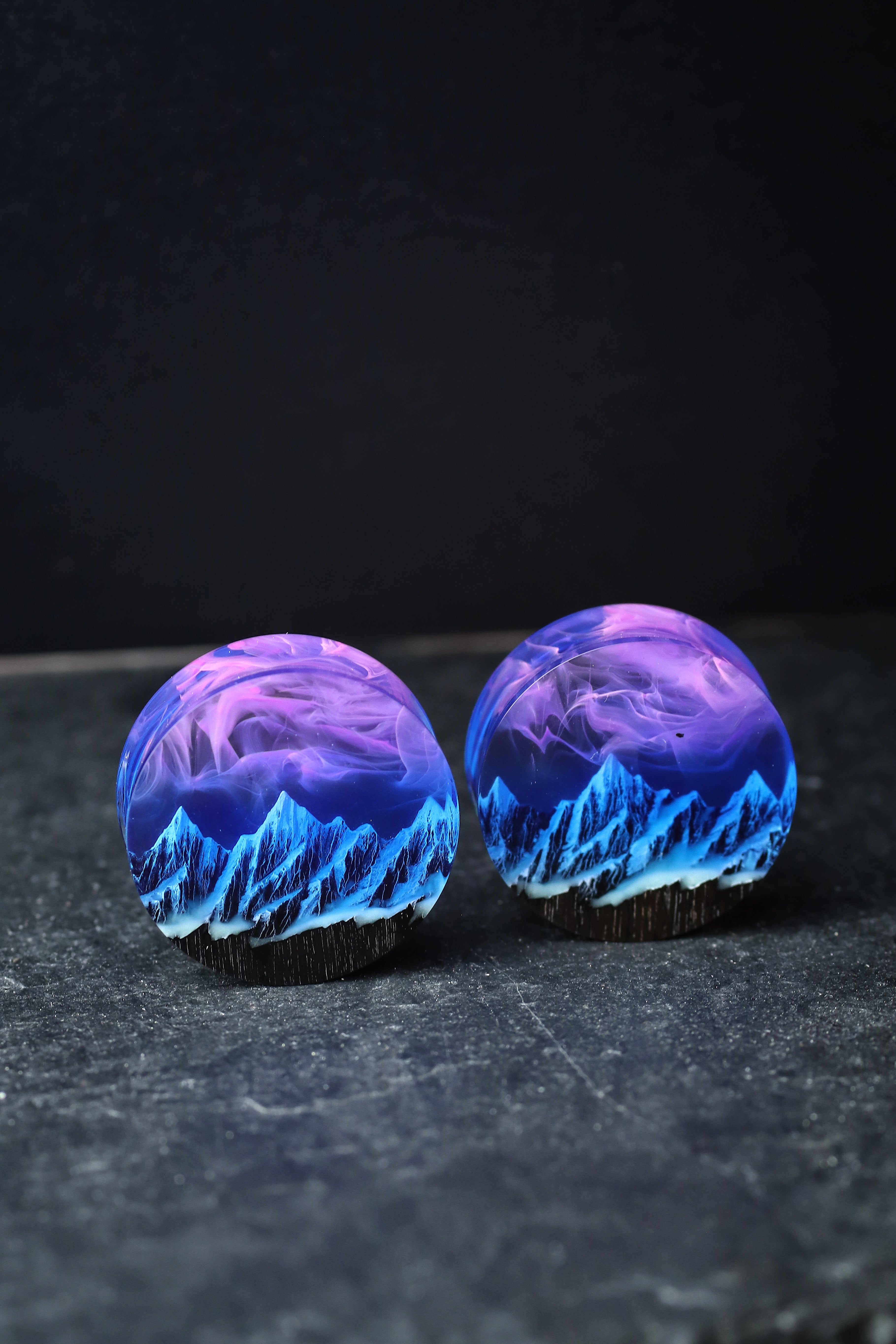 Handmade plug earring from black hornbeam wood and resin with mountains inside.