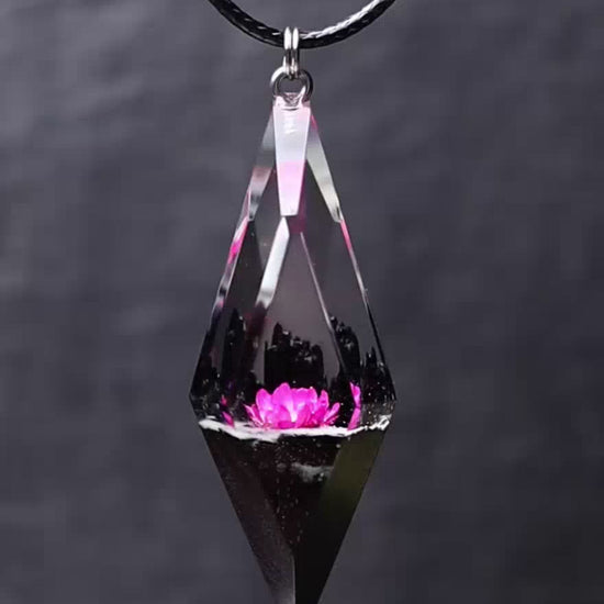 Handmade pendant from black hornbeam wood and resin with dried pink glixia inside. Can be personalized.