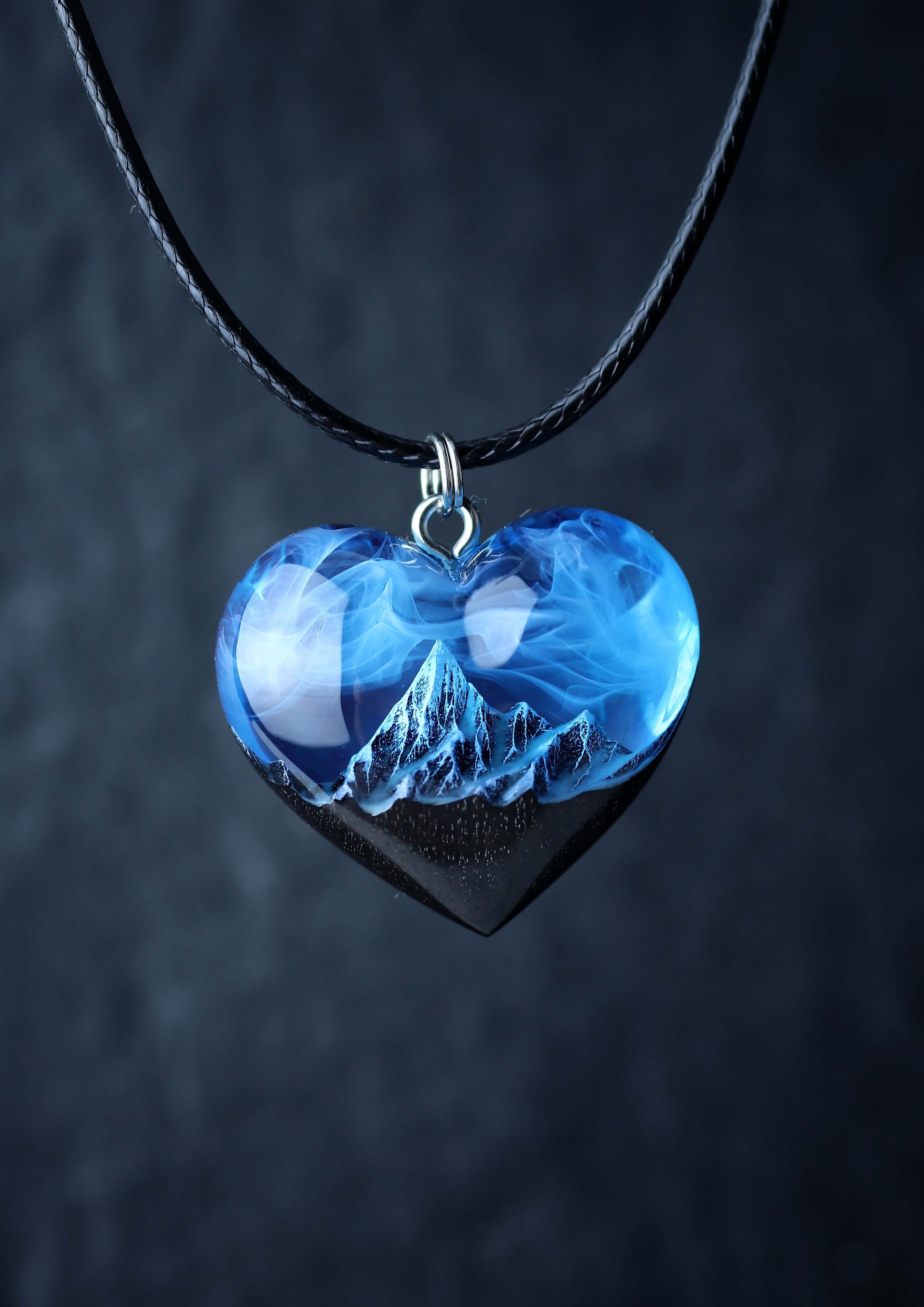 Handmade pendant in the shape of a heart from black hornbeam wood and resin with mountain inside.