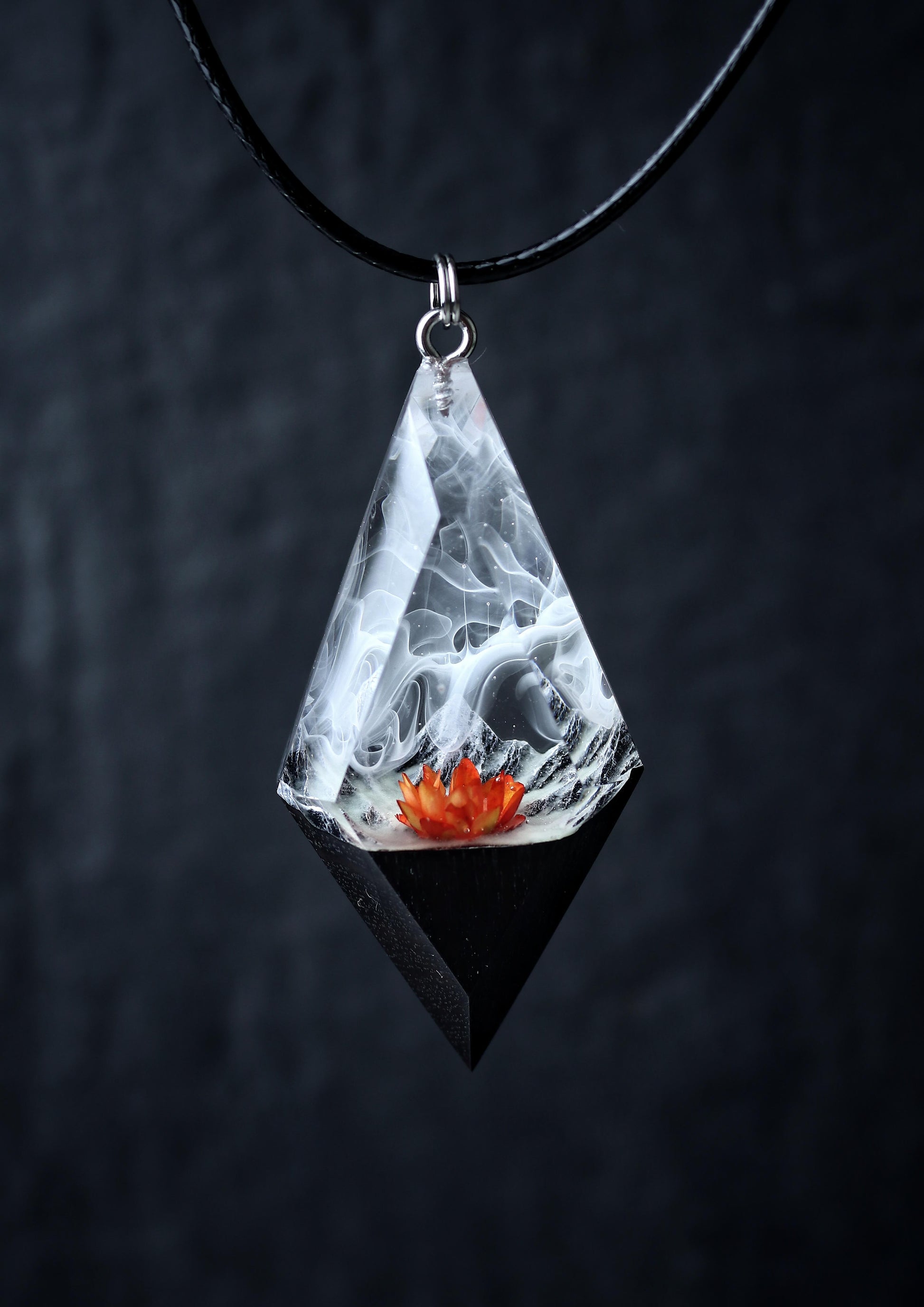 Handmade pendant from black hornbeam wood and resin with snow mountains and dried red chamomile inside.