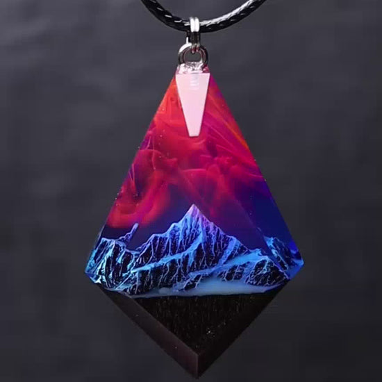 Handmade rhombus Nightfall pendant from black hornbeam wood and epoxy resin with snow mountains inside.